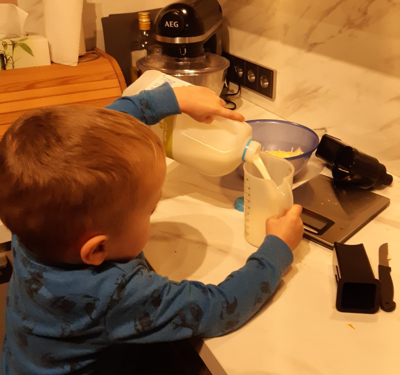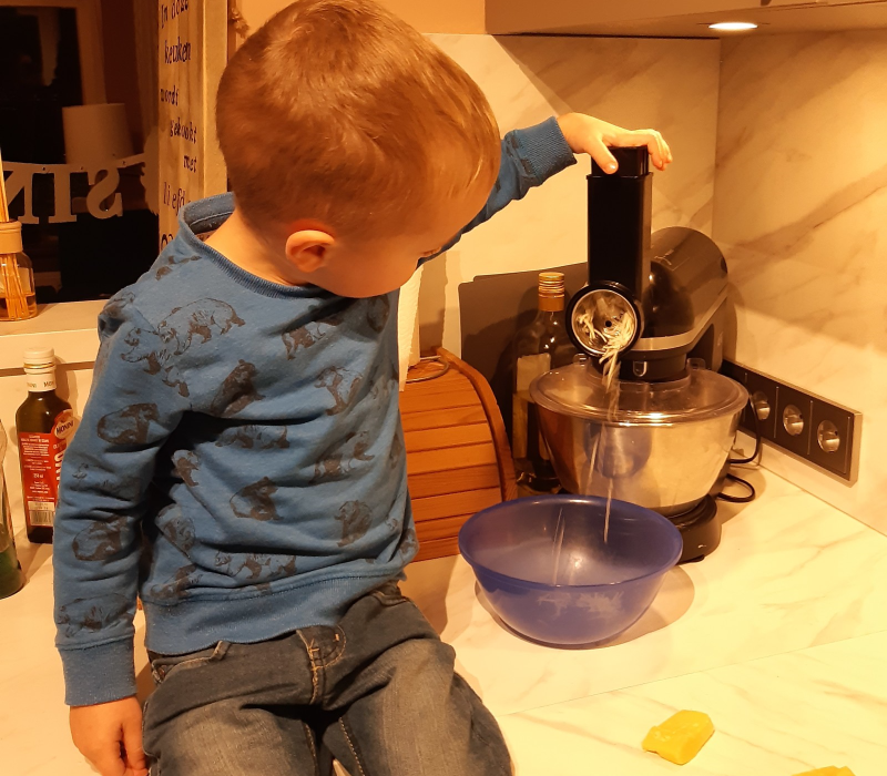 In dit recept heb je geraspte oude kaas nodig, maar ik ben er inmiddels achter dat je elke kaas die je in de koelkast hebt liggen kan gebruiken. Wel even zelf raspen he? Dat is het lekkerste. En met behulp van de keukenmachine raspen vindt Julian het ook nog extra leuk om te helpen.