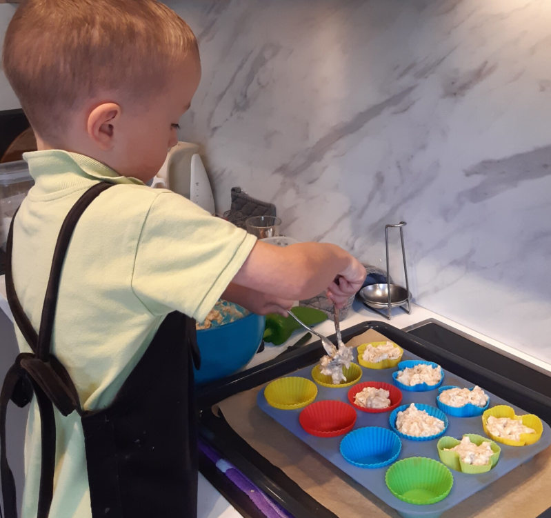 Deze aardappel cupcakes zijn een ideaal gerecht om samen met kinderen te maken. Julian wilde graag zijn eigen beslagkom en mixer gebruiken. Met de eieren klutsen ging dat nog goed. Daarna kon zijn mixer het niet meer aan. Het is ook een speelgoedmixer van de intertoys. En ook zijn beslagkom werd te klein. Hij kon ook zijn eigen (hele kleine) stamper gebruiken, dat vond hij erg leuk!