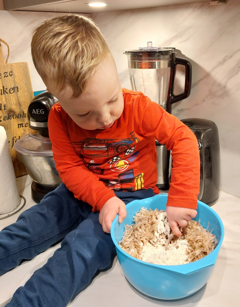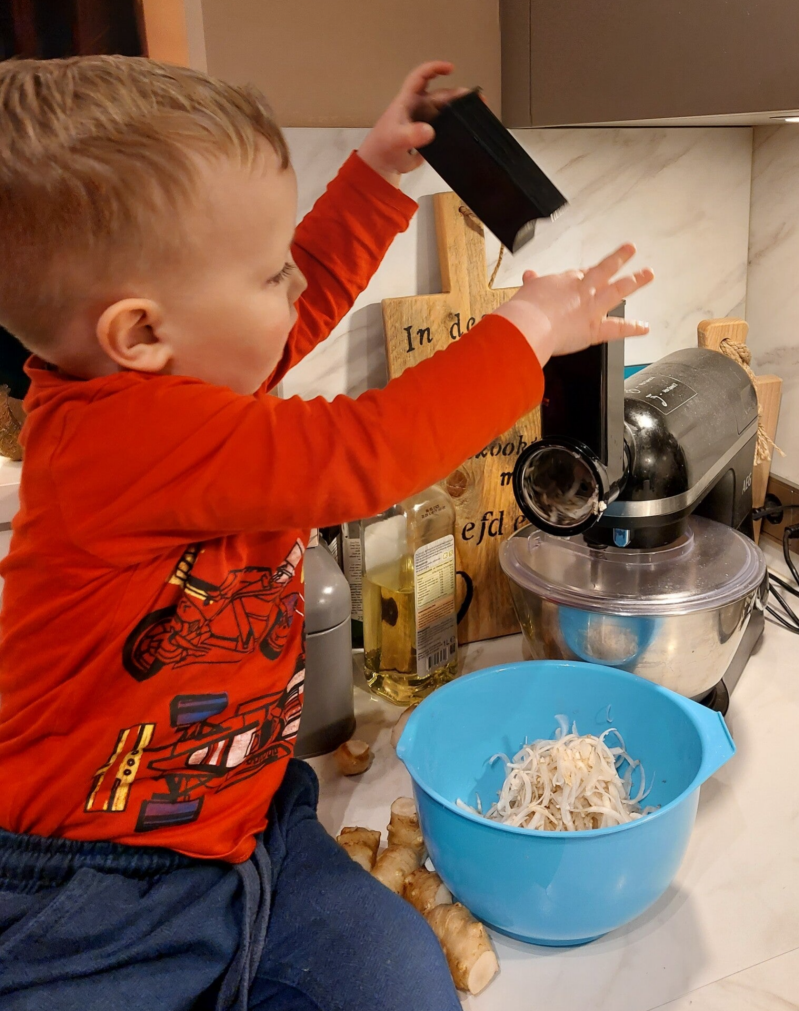 - Rasp de aardpeer. Ik gebruik hiervoor mijn keukenmachine