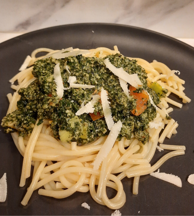- Ik heb de pesto kort verwarmd met paprika en prei om er een spaghetti 'saus' van te maken