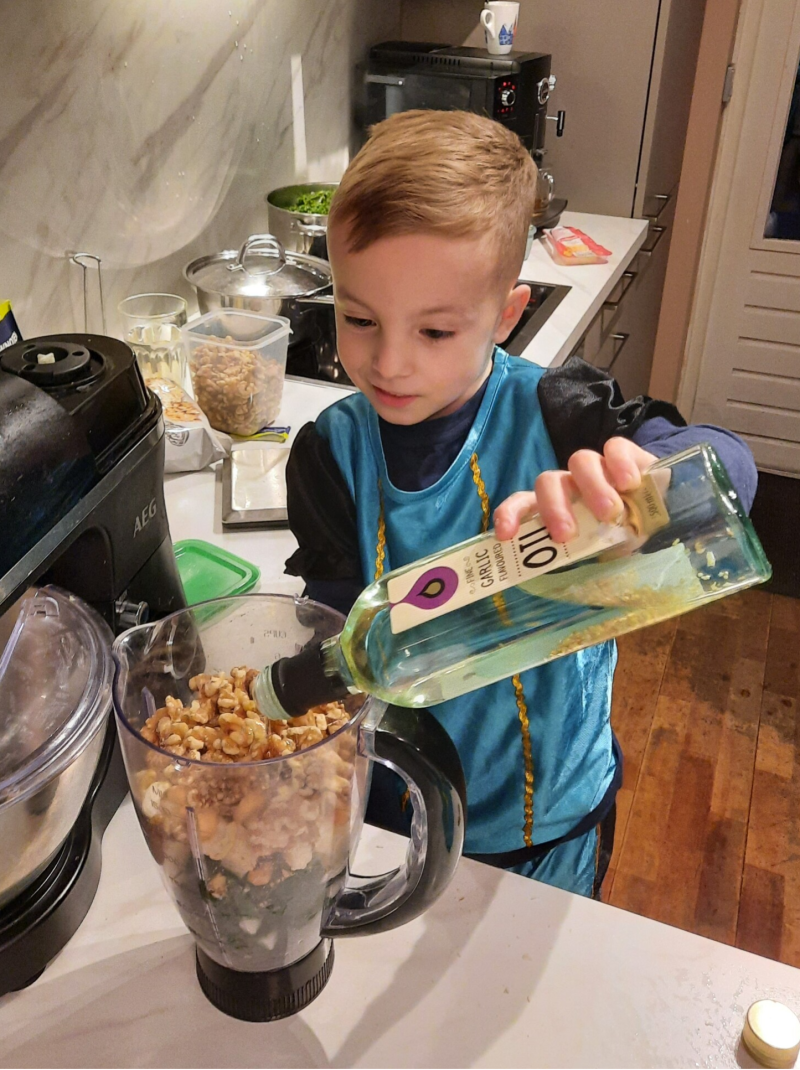 - Meng de boerenkool met de kaas, knoflook, cashewnoten, walnoten, citroensap en olijfolie in de keukenmachine