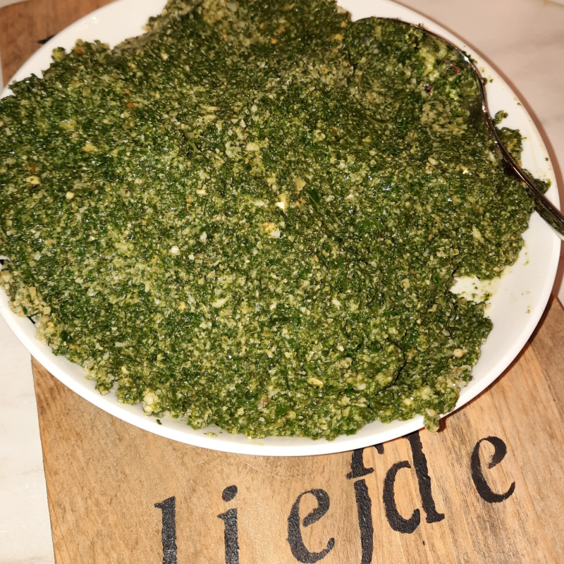 - Maal alles fijn tot de gewenste dikte. (een hakmolen of staafmixer werkt ook goed) Als het te dik is kan je wat olie toevoegen