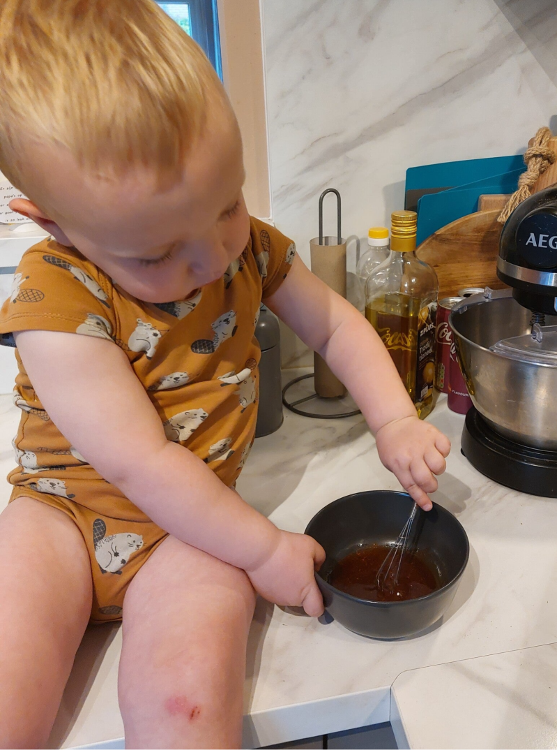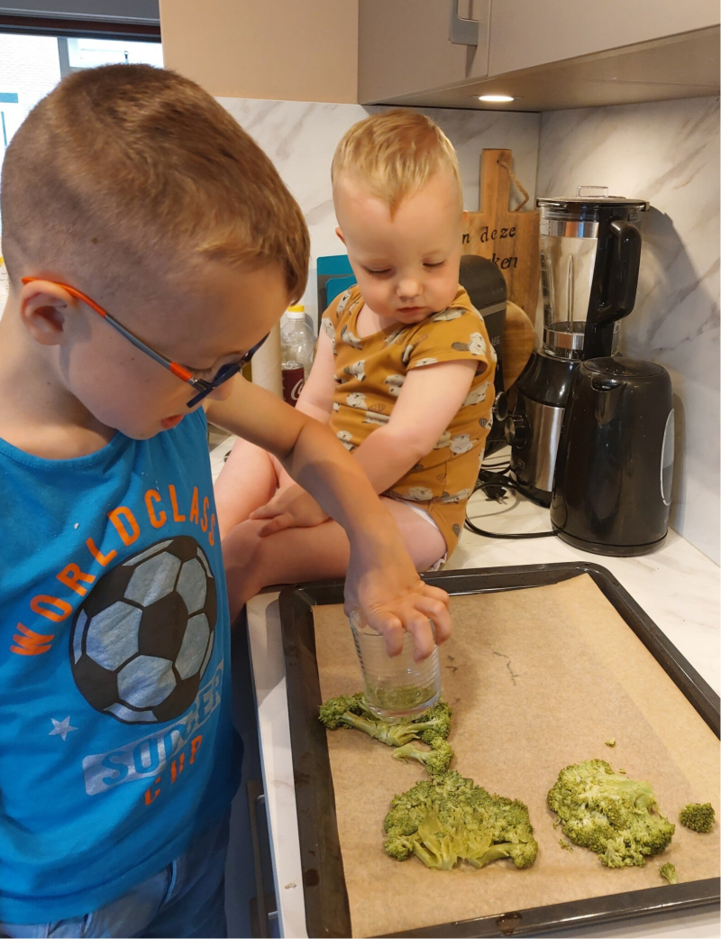 Julian vond het leuk om te helpen, met een glas de broccoli fijn maken, dat lekke hem wel wat. En Ivano kon goed helpen met de 'marinade' te maken en die op de gestampte broccoli te smeren.