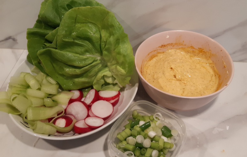 - Roer alle ingrediënten voor de mayonaise door elkaar en bereidt de garneringen voor