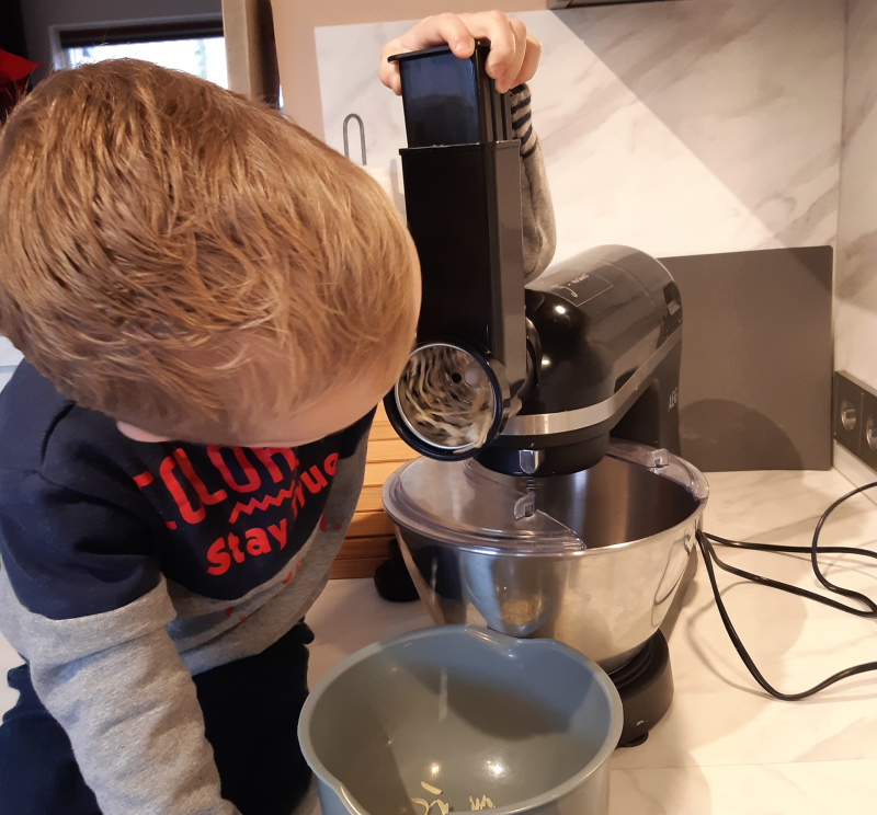 Julian kon goed helpen bij dit recept. Kaas raspen met de keukenmachine is sowieso al favoriet bij hem. En hij vindt het ook erg leuk om kruiden ergens doorheen te doen. 'nog een beetje?' is dan zijn standaard vraag. Zolang hij dat niet doet bij het zout vindt ik het prima ;-)