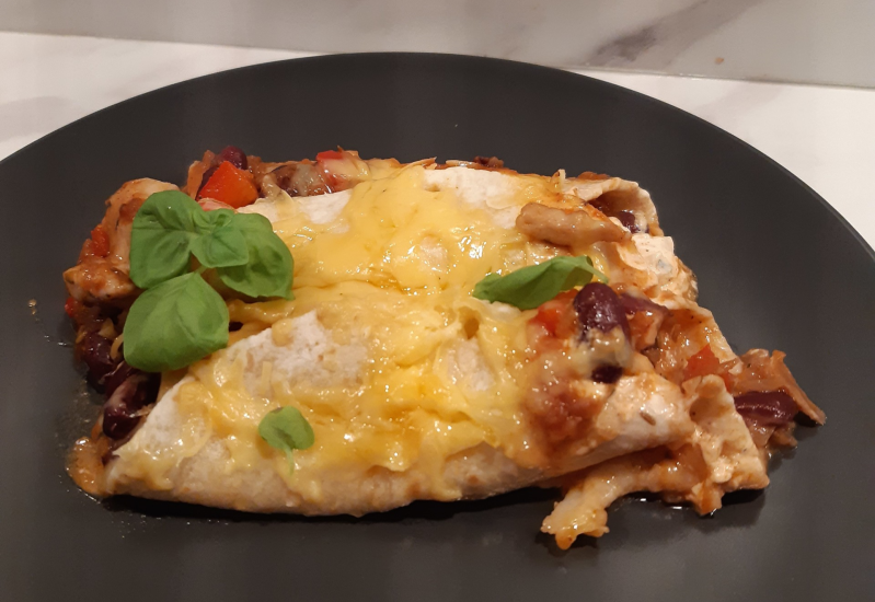 - Doe alle tortilla's in de ovenschaal. Als je nog kipmengsel over hebt, kan je dit in de schaal erbij scheppen. Ook de dipsaus kan er nog in de ovenschaal bij