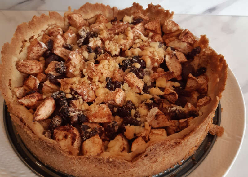 - Doe het appelmengsel in de vorm. Mocht  je nog deeg over hebben, dan kan je dat over de taart heen verkruimelen. Maar zoals je kunt zien op de foto had ik niet zo heel veel deeg meer over. Dat kan er ook aan gelegen hebben dat Julian en ik smullen van deeg ;-)
