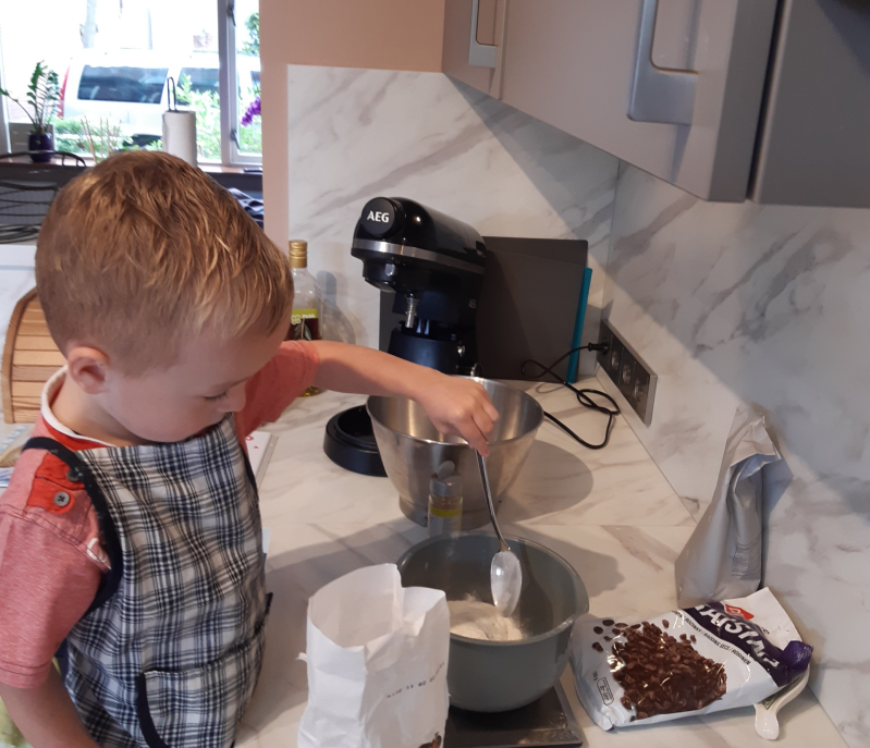 Een appeltaart is een goede taart om samen te maken, het wegen van de boter, bakmeel en suiker vond Julian erg leuk! Hij begint steeds meer de cijfers te herkennen, zijn we dus toch ook nog educatief bezig ;-)