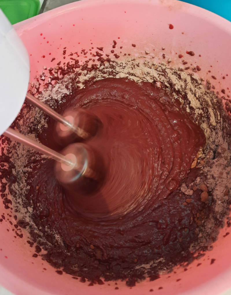 Dus mijn missie is om iets te maken met de rode biet wat ze dan wel lusten. Lang leve het internet, want er zijn heel veel recepten met rode biet te vinden. We hebben al een keer chips gemaakt en nu stond de brownie op de planning.