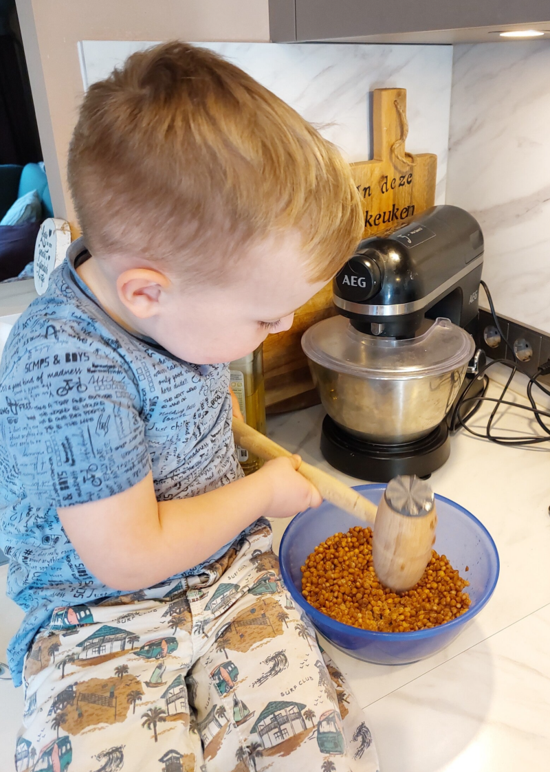 - Maak de kikkererwten fijner, dit kan met de staafmixer of met een vleeshamer