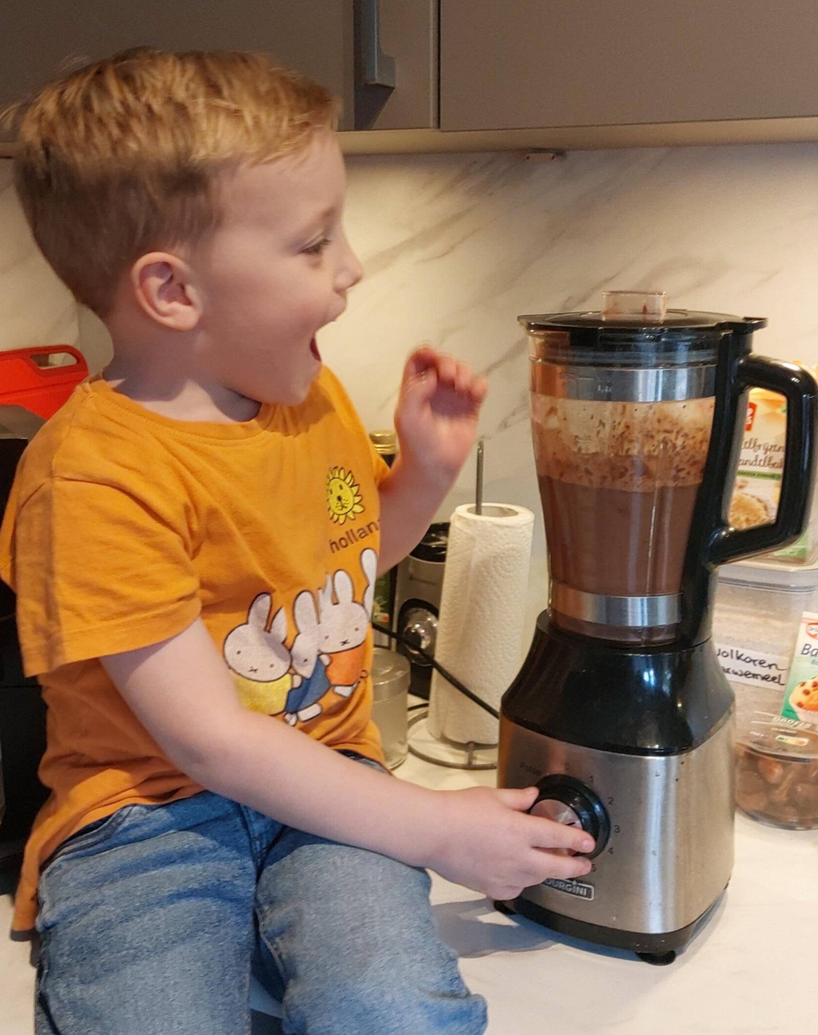 - Mix de linzen, banaan, cacaopoeder, melk en dadels in de blender