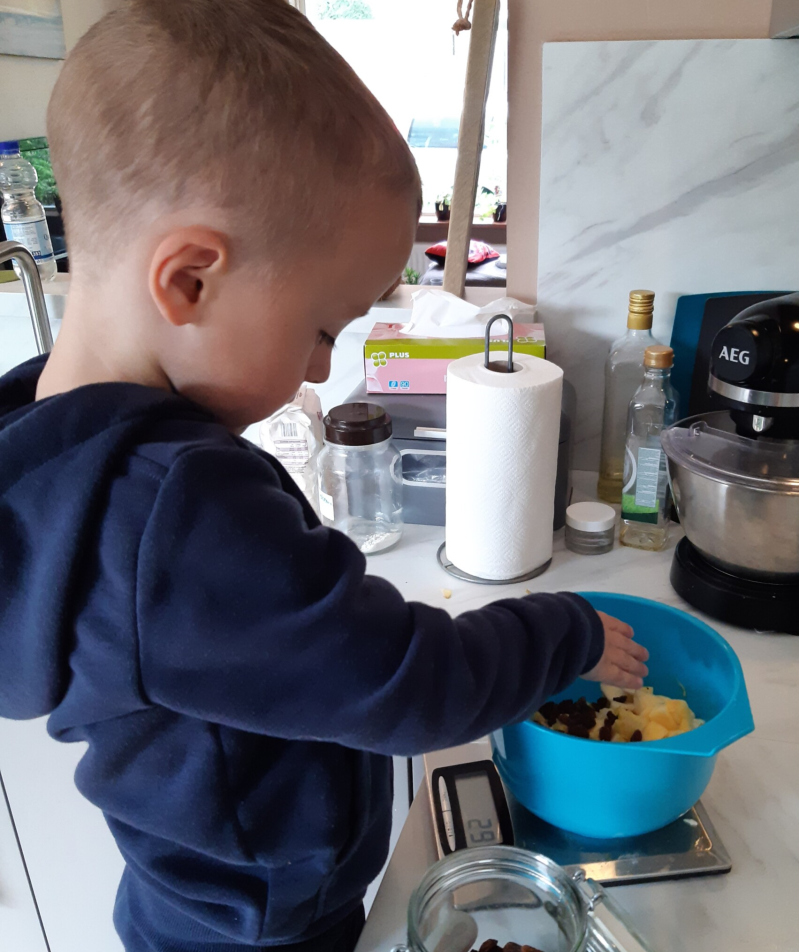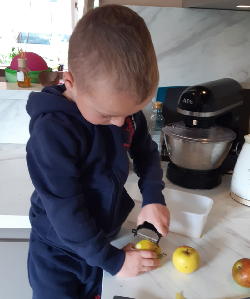We begonnen met het zelf maken van appelmoes en appelflappen. Die lukte beide heel goed! En toen zat ik op de site van ChicksLoveFood; echt een aanrader om te volgen, gemakkelijke duidelijke en heerlijke recepten. En daar kwam ik deze appelstrudel tegen. Nou eigenlijk maakte zij er een appel-peer-strudel van, maar aangezien wij zoveel appels hebben, koos ik ervoor om alleen appels toe te voegen.