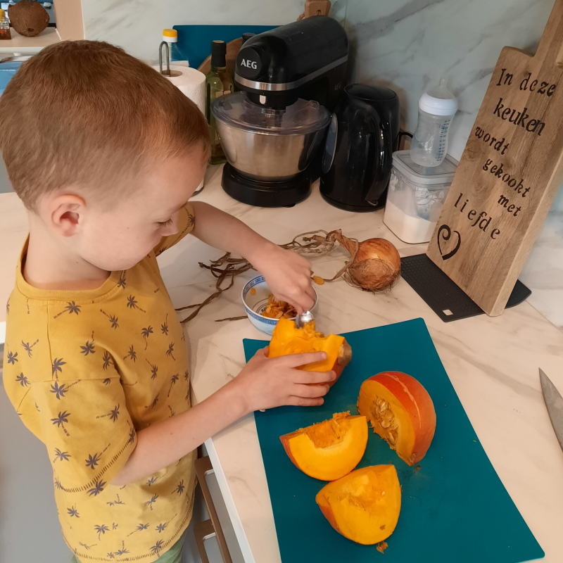 En nu is er veel pompoen te oogsten. De groente die ik als kind echt niet lekker vond, maar waar ik nu zo van kan smullen. Ook Ivano vindt pompoen lekker, hij krijgt het gekookt samen met aardappelen.