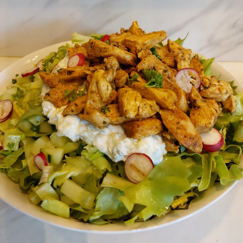 - Leg de sla op een schaal, hier bovenop de tzatzikisaus en als laatste de kip.