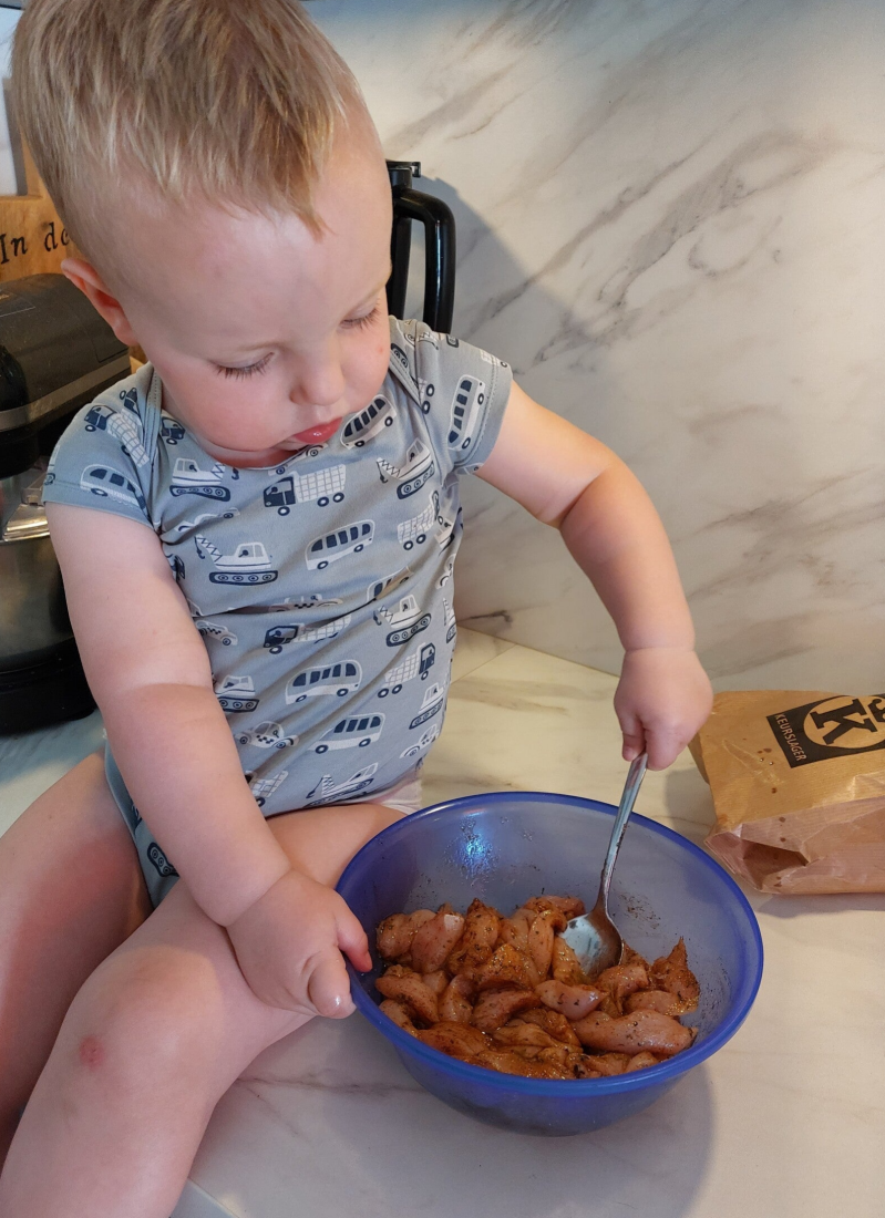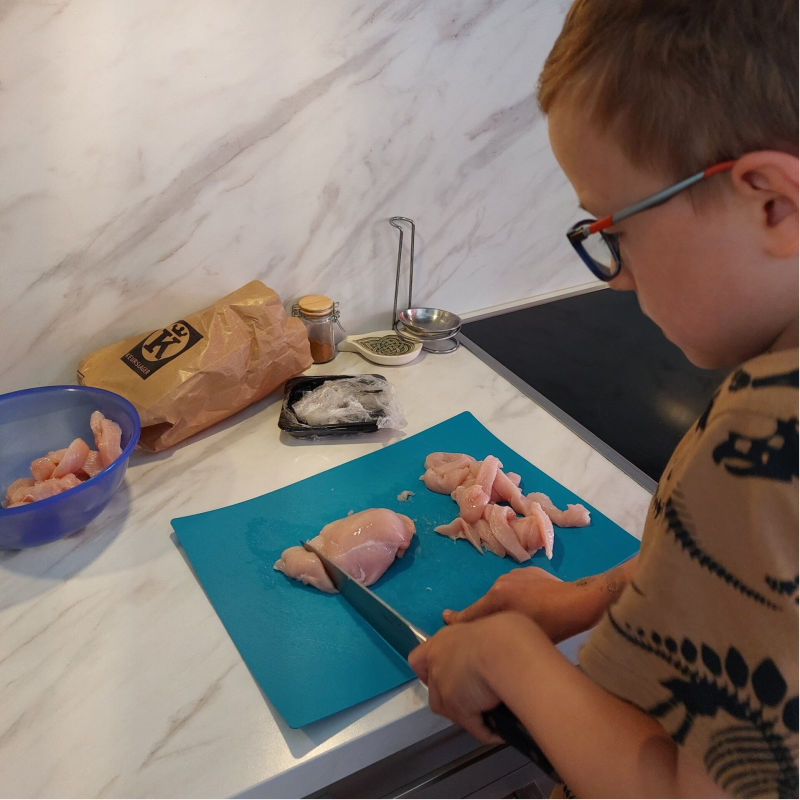 Ook het verschil in helpen in de keuken tussen de kinderen is groot. Julian komt af en toe bij me kijken, herkent groente en proeft graag tussendoor. Hij mocht deze keer met het grote mes kip snijden. Dat was een nieuwe ervaring voor hem en vond hij ook best wel spannend. Maar ik stond er naast en hield het goed in de gaten. Want stiekem vond ik het ook wel spannend ;-) Hij hield de rauwe kip niet vast, dat vond hij te spannend.
