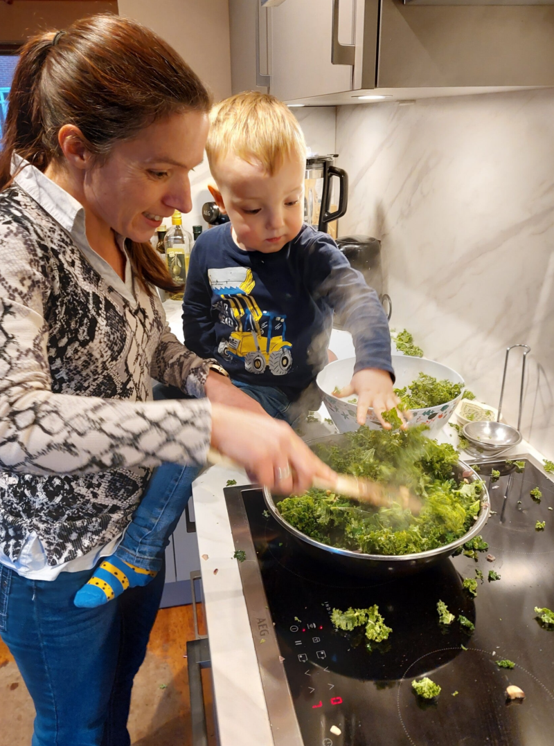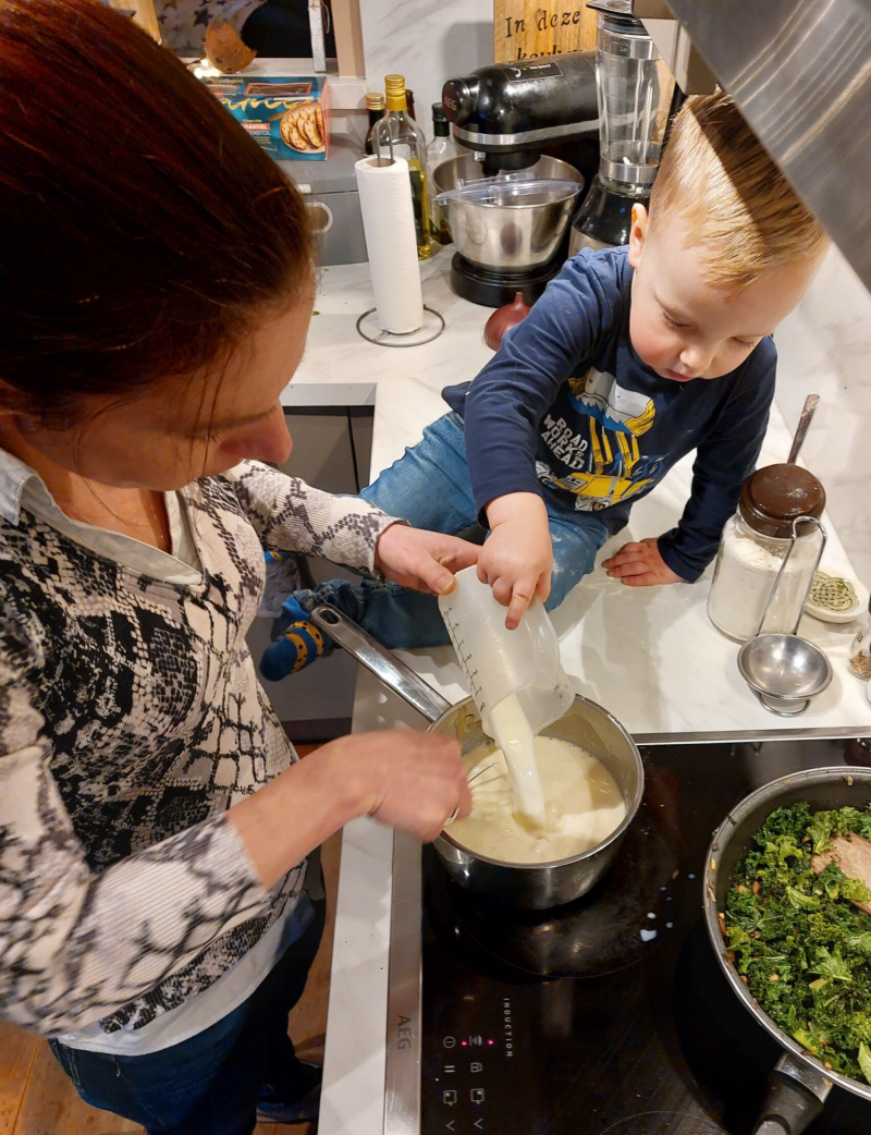 En het was een geniet momentje deze week om samen met mijn kinderen in de keuken te staan. Julian die niet zo veel wil mee helpen, maar wel graag foto's maakt. En Ivano vindt het echt leuk. Als ik hem op het aanrecht zet, zegt hij nu zelf "samen in de keuken" En dat dan de boerenkool ook naast de pan gaat in plaats van erin? Dat geeft niet, we hebben samen van dit moment genoten en ik ben blij dat Julian het heeft vast kunnen leggen!