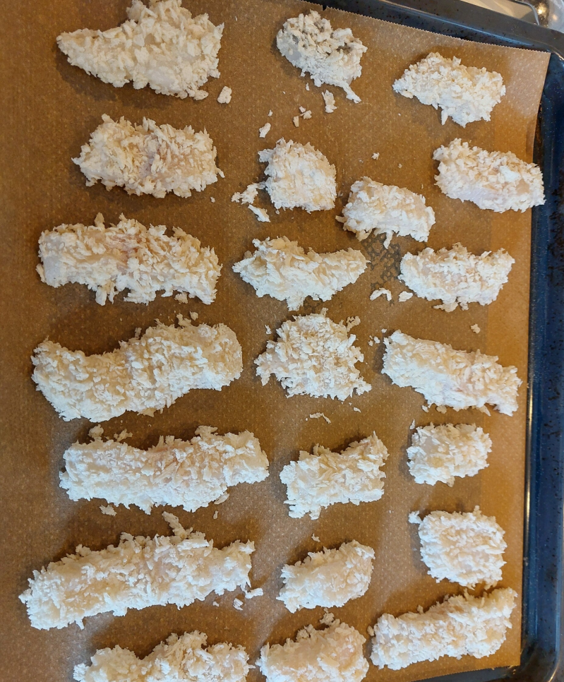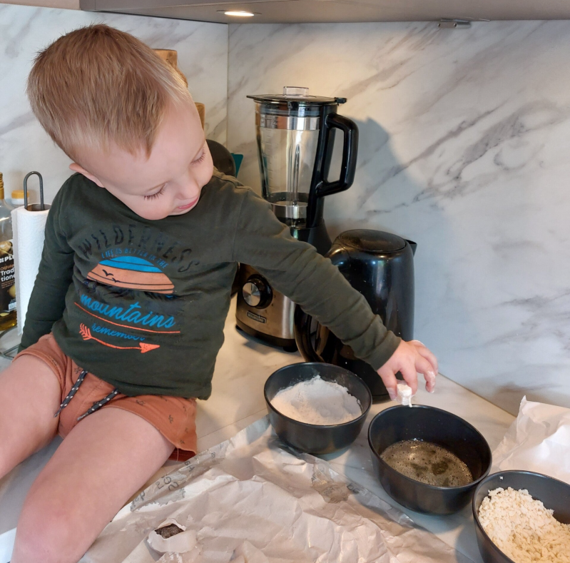 Het is een gerecht wat gemakkelijk te maken is en waar Ivano heel goed bij kon helpen. Van het roeren in het eiwit tot het maken van de vissticks. Ivano deed een stukje vis in de bloem en daarna in het ei. Ik haalde het dan uit het ei en deed het door de panko. Ik koos hier bewust voor, omdat Ivano tussendoor zijn vingers nog wel eens in de mond stopt. En dat leek me met rauw ei nou niet zo'n goed idee.