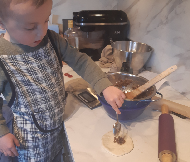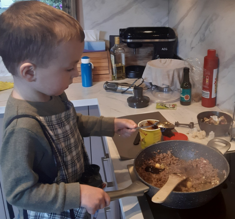 Julian vond het erg leuk om te helpen, alhoewel hij me wel even raar aan keek toen ik zei dat er appelstroop door het gerecht moest :-)