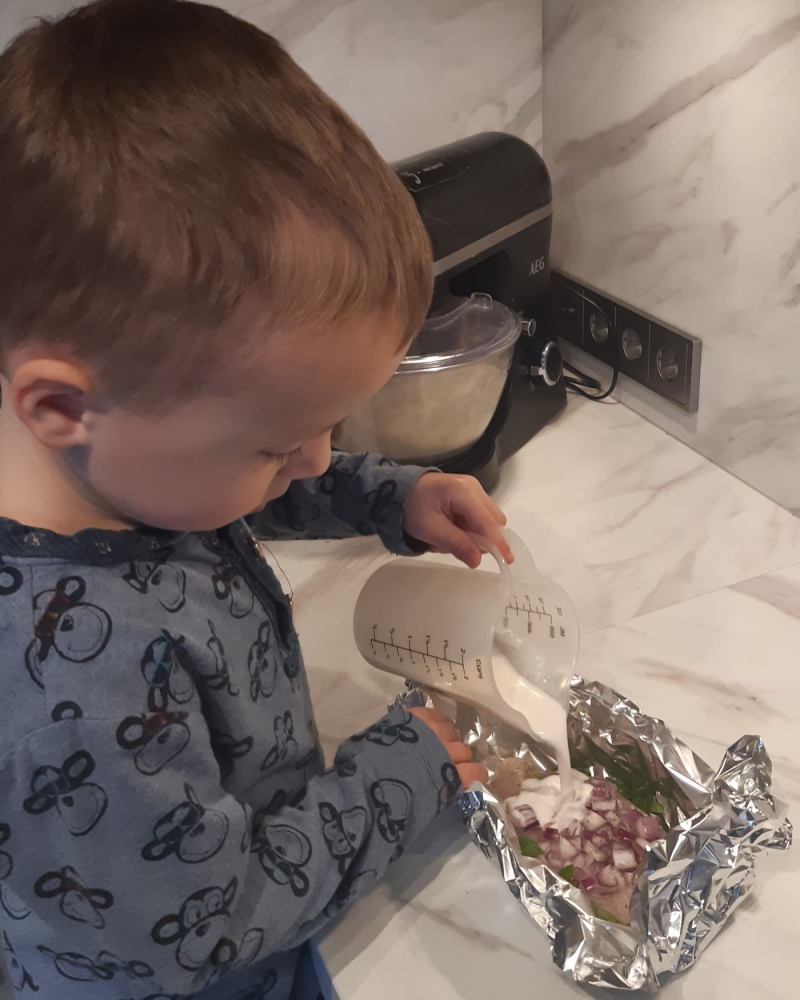 - Vouw de folie een beetje omhoog zodat je de kokosmelk erover heen kan gieten