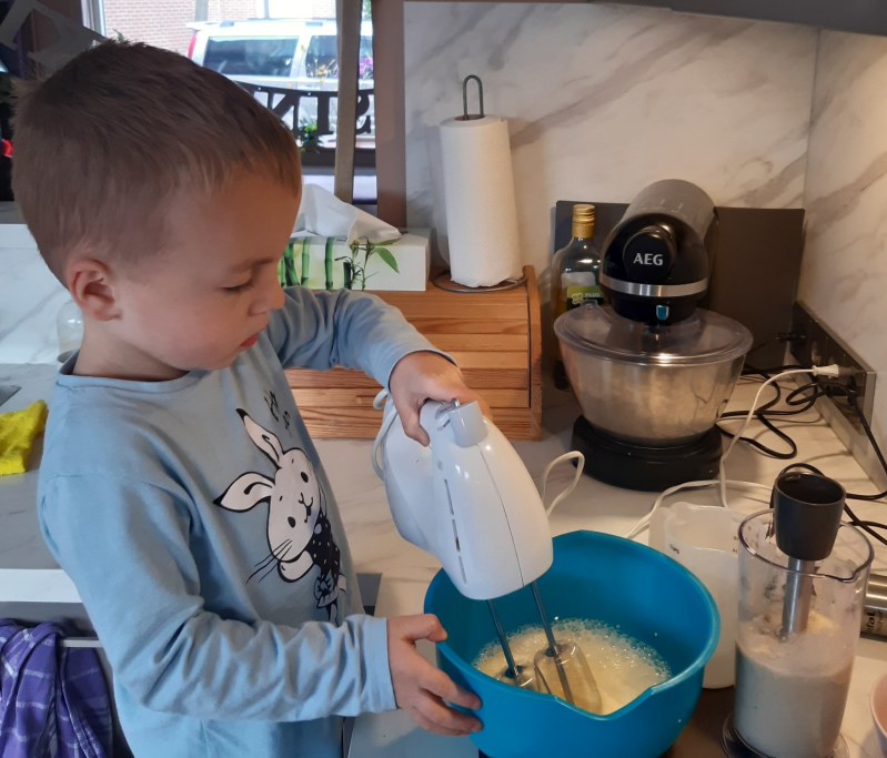 Julian had geen zin in pruimen snijden, maar de banaan in de blender vond hij toch wel heel leuk! En de havermout voorzichtig over het beslag doen vond hij ook heel leuk.