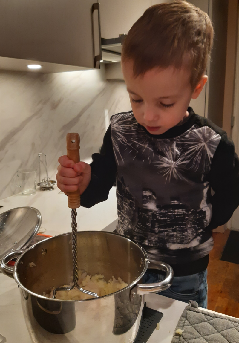 - Giet de aardappels en schorseneren af en stamp ze fijn met de stamper