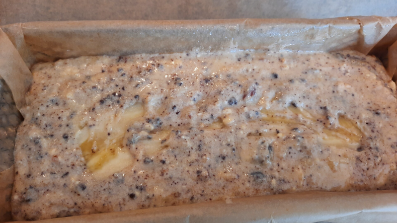- Stort het beslag in de vorm en druk de doorgesneden banaan in de bovenkant van het beslag (met de bolle kant naar beneden)