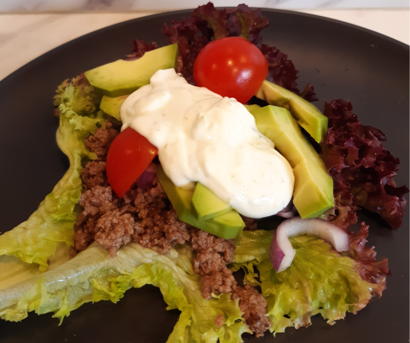 - Leg een sla blad op een bord en beleg dit met tomaat, avocado, ui en gehakt. Doe er vervolgens een schep crème fraiche op