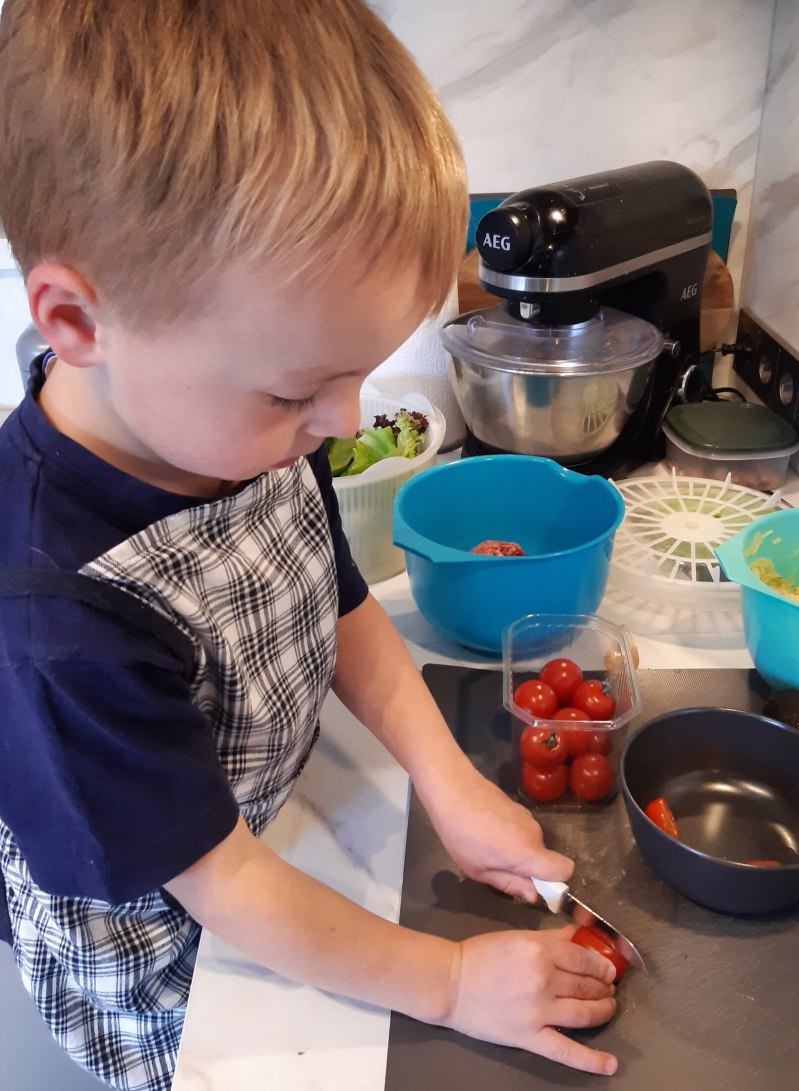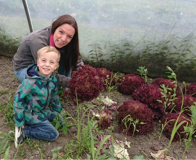 Voor deze week was er o.a. lollo-rosso- sla te oogsten. Julian at de sla al voordat deze op zijn bord lag en heeft wel 3 porties gegeten.
