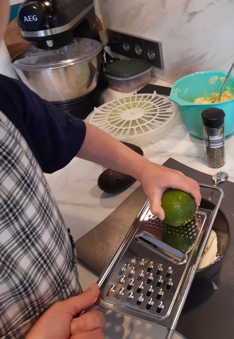 - Doe de crème fraiche in een bakje. Rasp hierboven de limoen. Voeg ook een beetje limoensap toe